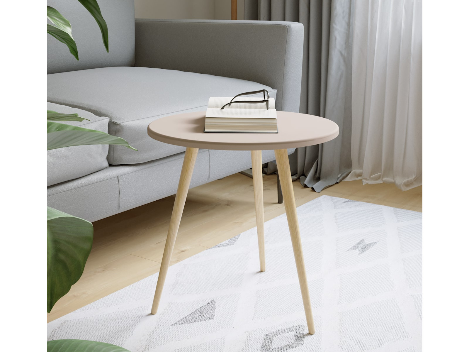 В дизайне использована простая геометрия столешницы в сочетании с деревянными опорами.