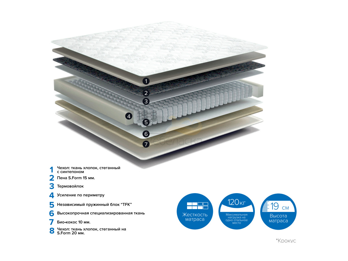 Наполнение: Независимый пружинный блок "TFK 120" + ППУ 1,5 см/био-кокос + усиление по периметру