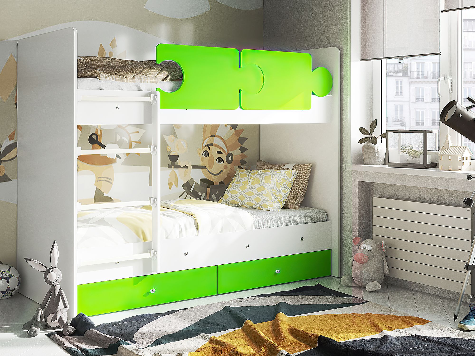 - Кровать двухъярусная Тетрис латы с бортиками белый-лайм