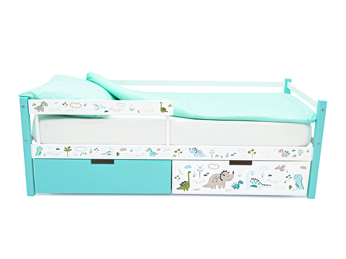 - Кровать-тахта Svogen с ящиками и бортиком с фотопечатью мятный/динозаврики
