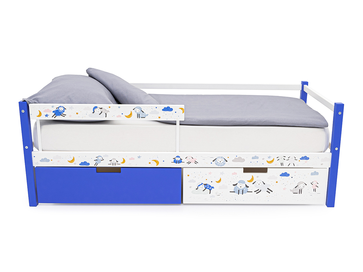 Кровать-тахта Svogen с ящиками и бортиком с фотопечатью синий/барашки