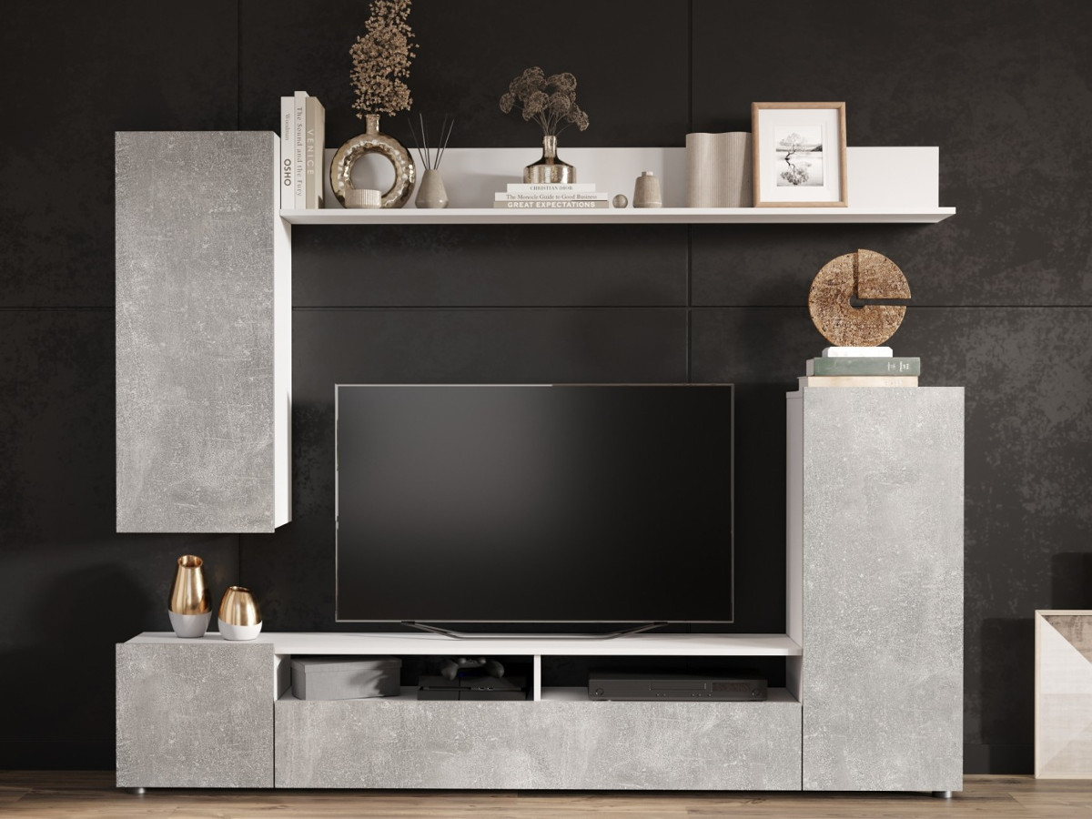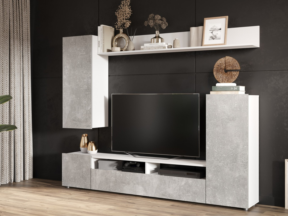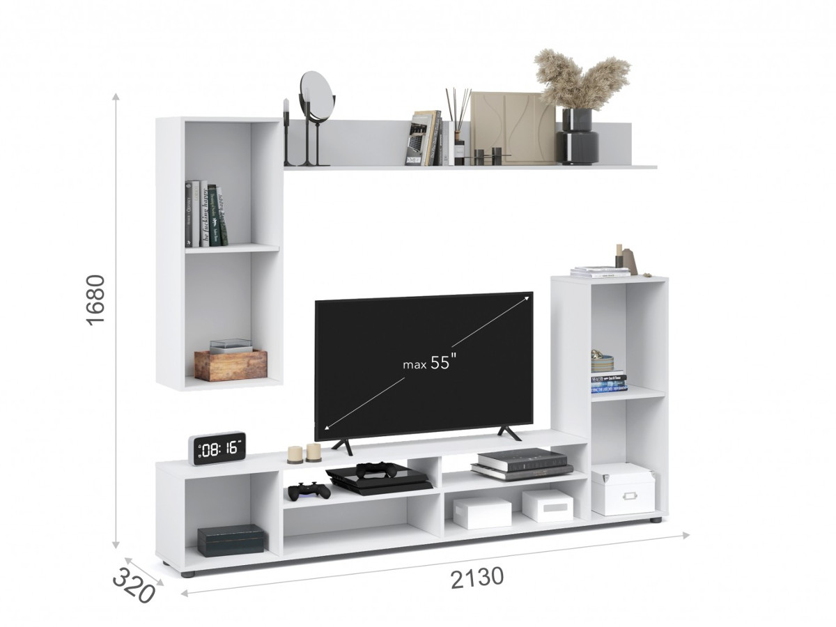 - Нет ничего лишнего – большая ниша под ТВ, закрытые шкафчики и открытая полки, позволят вместить в себя всё самое необходимое.