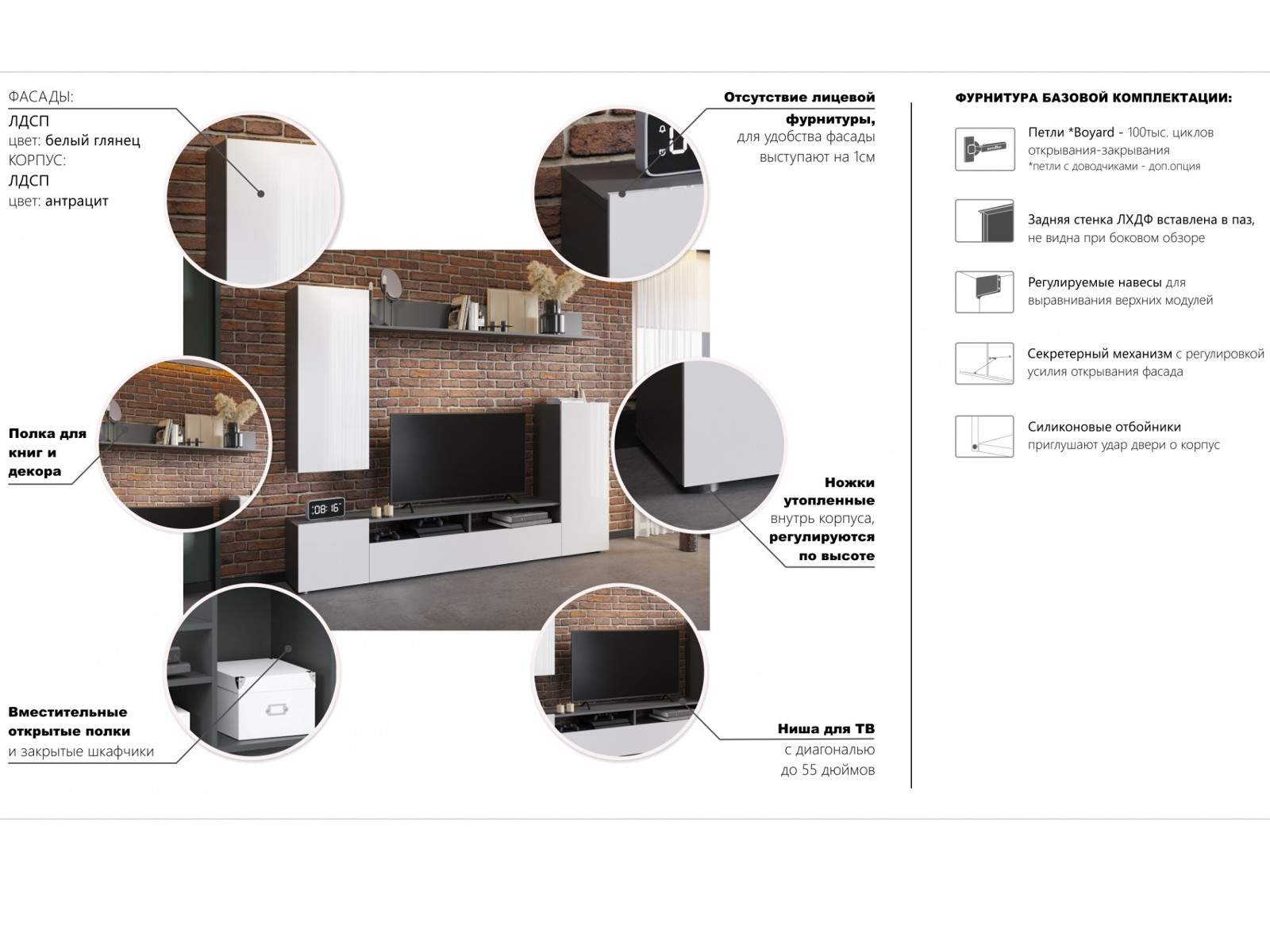 - Большая ниша для телевизора, закрытые шкафчики и открытые полки вместят в себя всё самое необходимое.