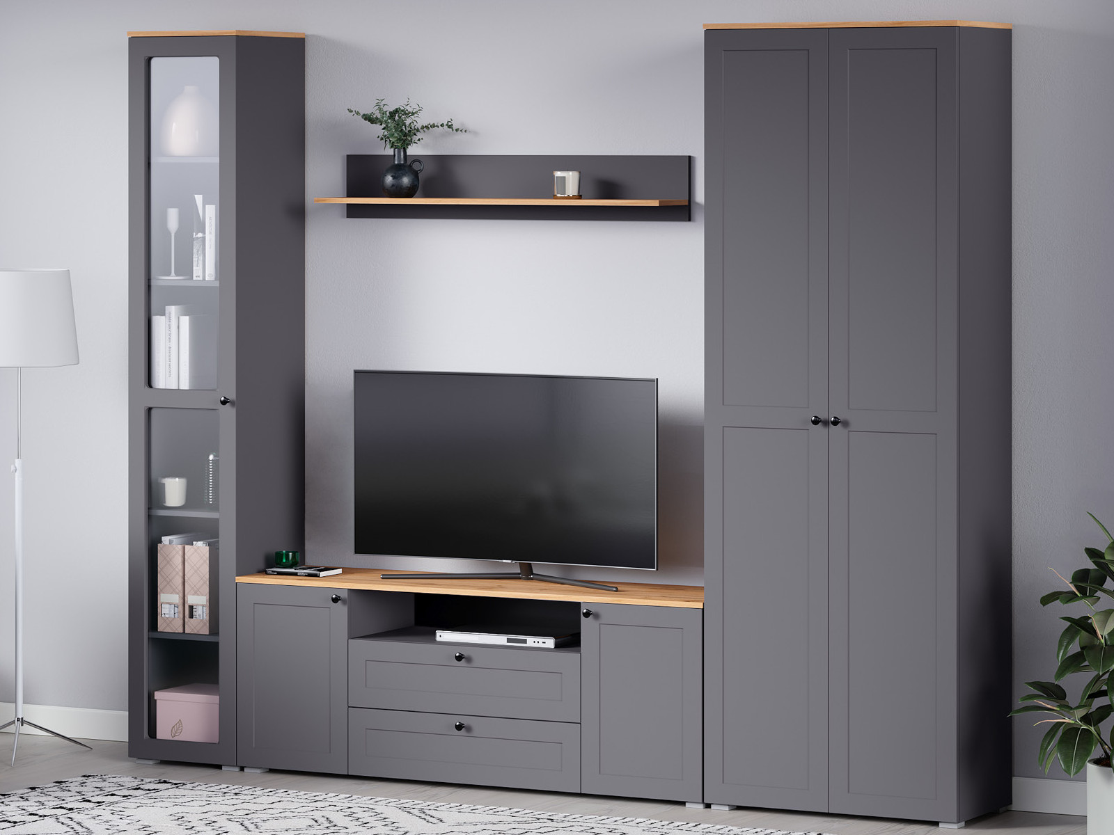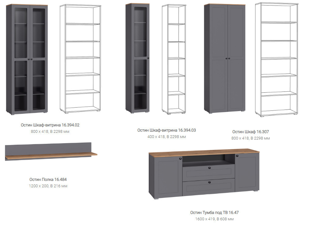 Цена указана за комплект: Полка 16.484, Тумба под ТВ 16.47, Шкаф-витрина 16.394.02, Шкаф-витрина 16.394.03