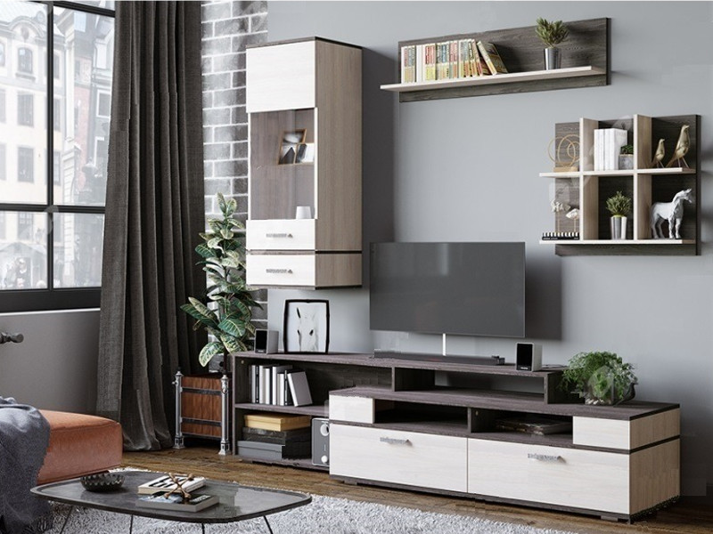 Гостиная состоит из: Пенала - 1 шт, полка 670 - 1шт, полка 1130 - 1 шт и тумба ТВ.