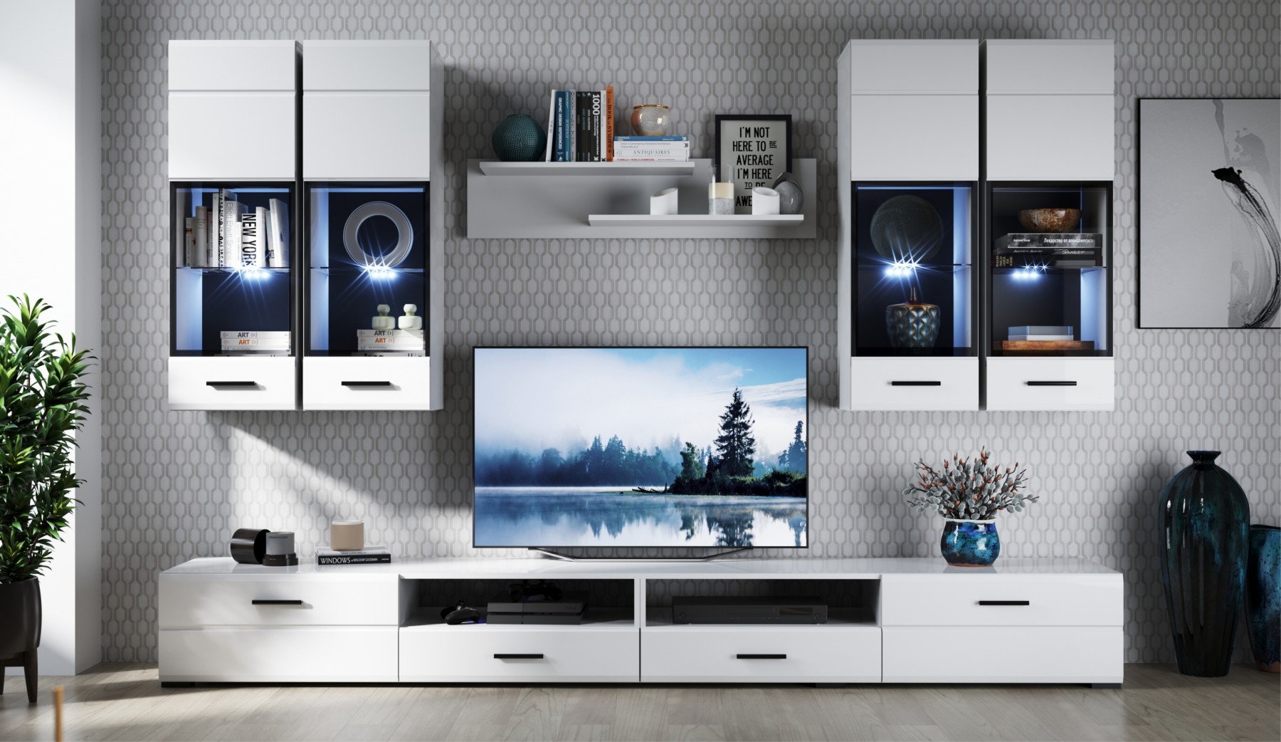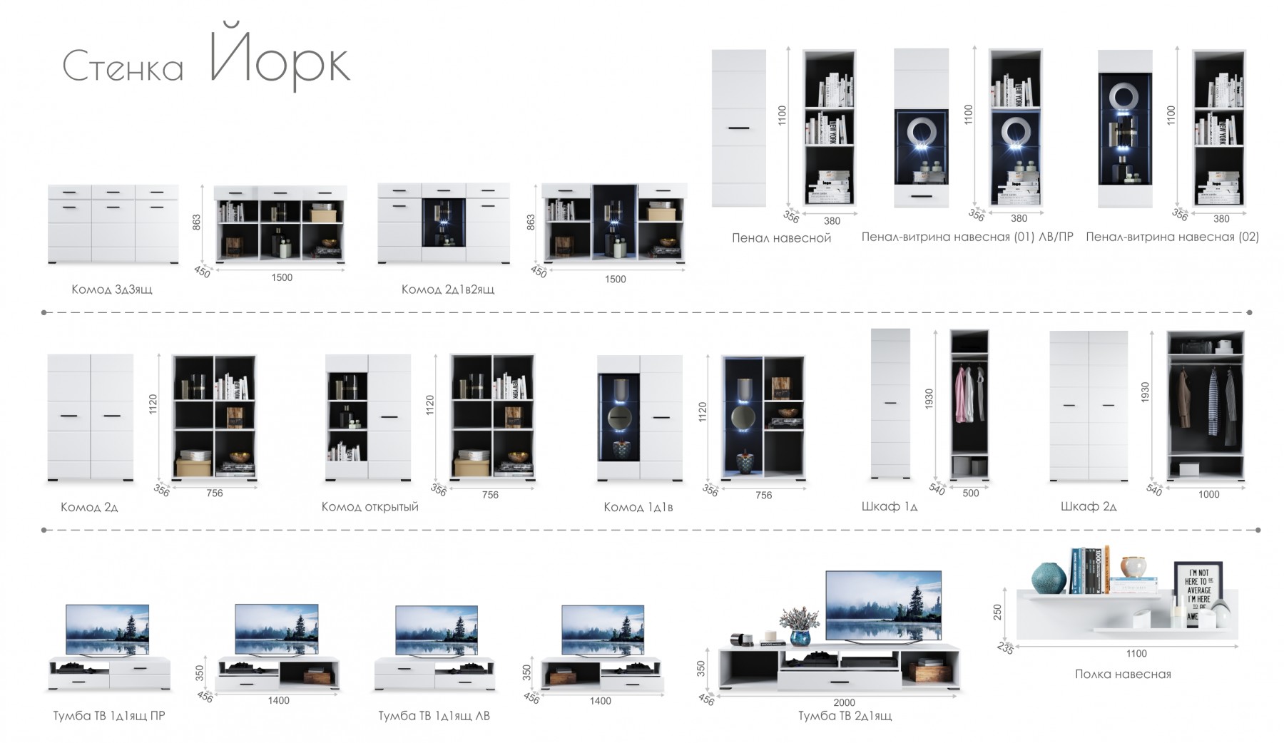 Гостиная модульная, комплектуется по вашему выбору. Цена за комплект на главном фото - Тумба ТВ 1д1ящ ЛВ, Тумба ТВ 1д1ящ ПР, полка навесная, Пенал-витрина навесная (01) ЛВ 2 шт, Пенал-витрина навесная (01) ПР 2 шт