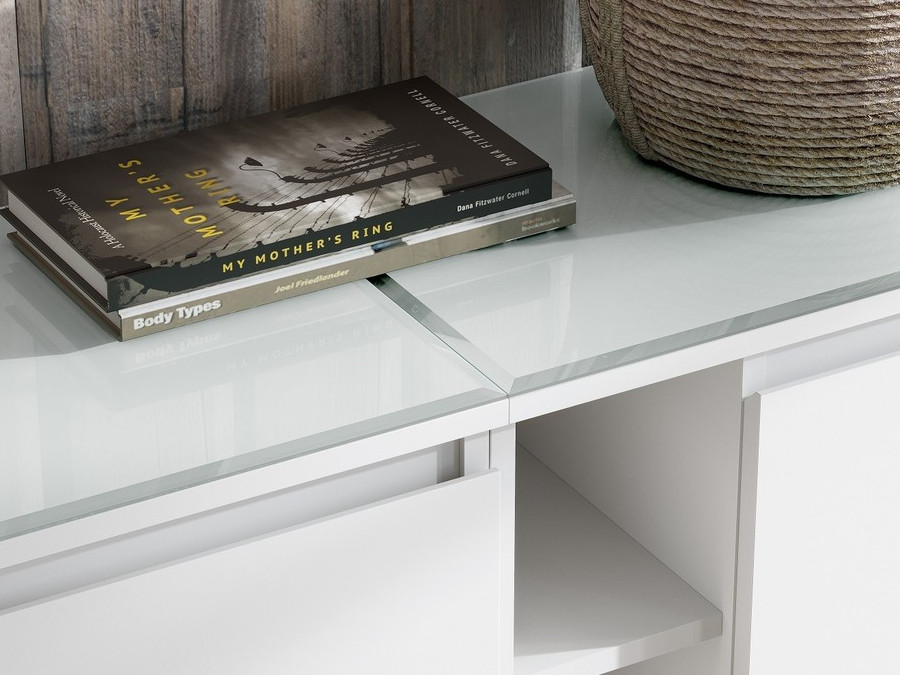 - Тумба покрыта матовым стеклом «сатинат» с фацетными гранями. Из нескольких тумб можно собрать композиции комодов различных габаритов.