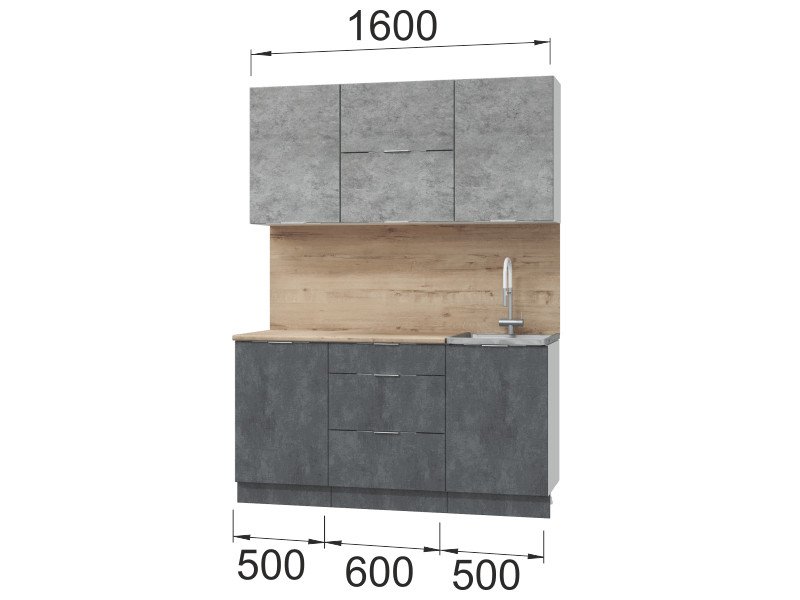 - Фасад: МДФ + пленка ПВХ (шкафы настенные - "Бетон светлый", шкаф-столы кухонные - "Бетон темный"