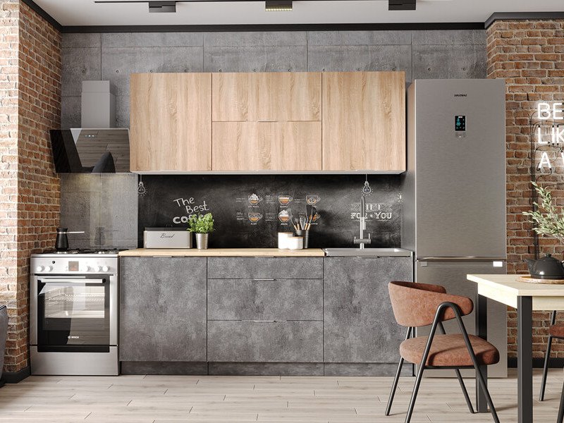 - Фасад: МДФ + пленка ПВХ (шкафы настенные - "Дуб сонома", шкаф-столы кухонные - "Бетон темный"