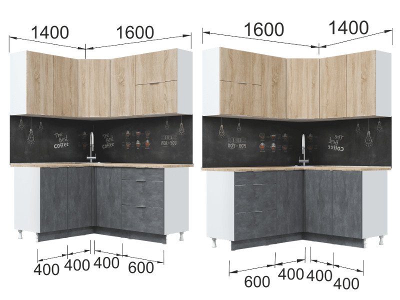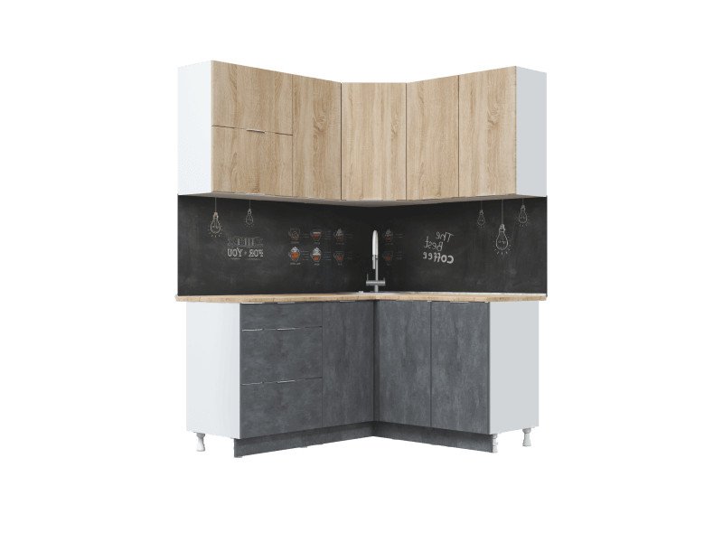- Фасад: МДФ + пленка ПВХ (шкафы настенные - "Дуб сонома", шкаф-столы кухонные - "Бетон темный"