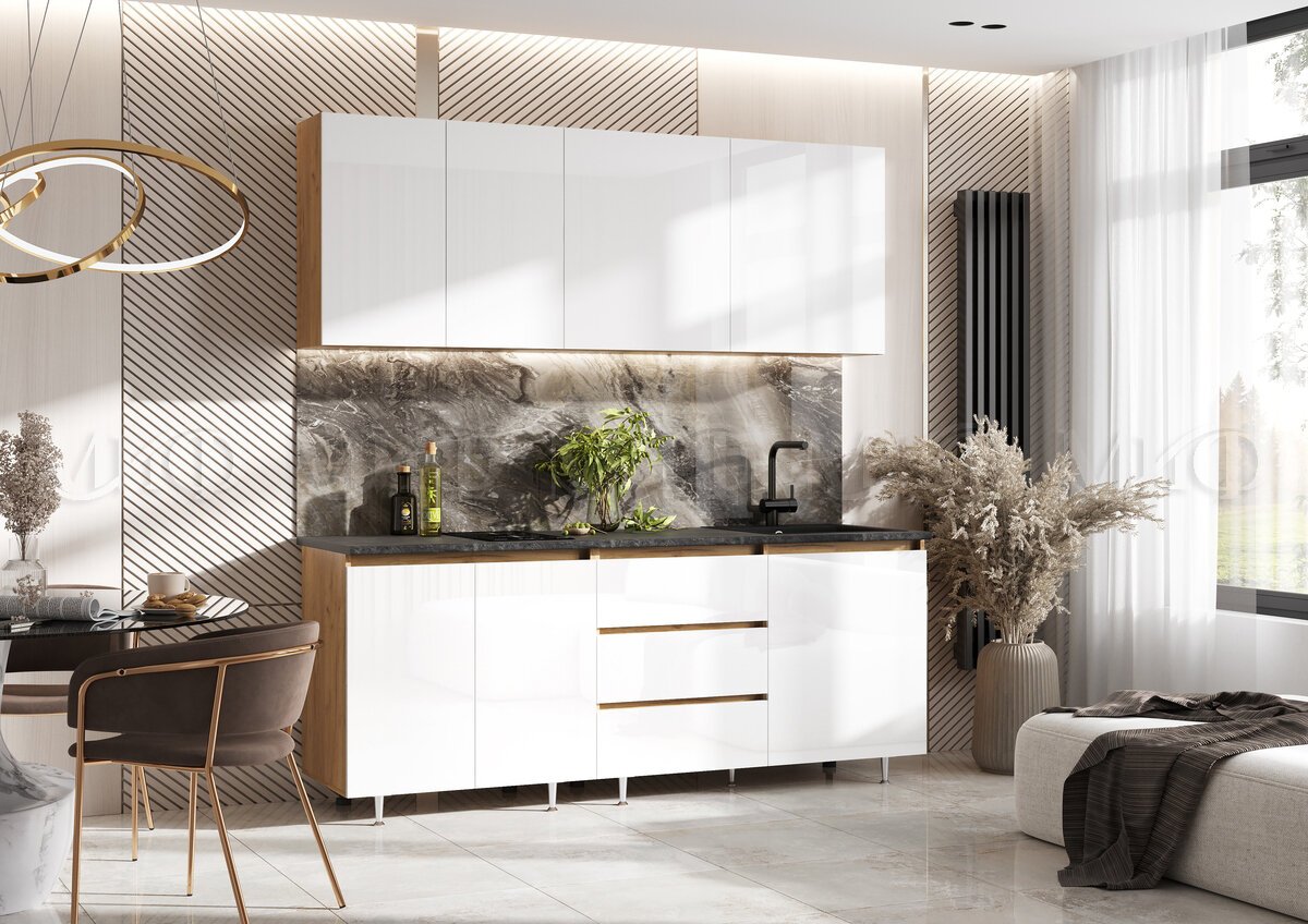 - Кухня Челси 2000 мм Компановка №2 Белый глянец холодный, Дуб Крафт (Кастилло)