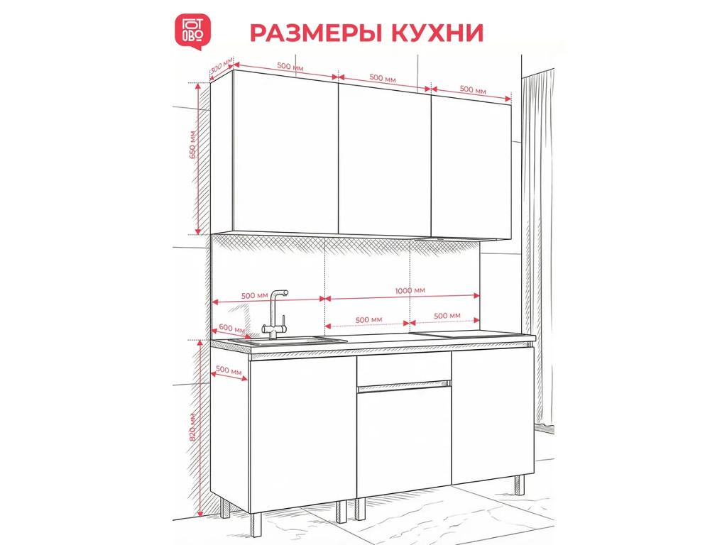 Высота нижних модулей с учетом столешницы и опор составляет 850 мм, глубина модулей - 500 мм.