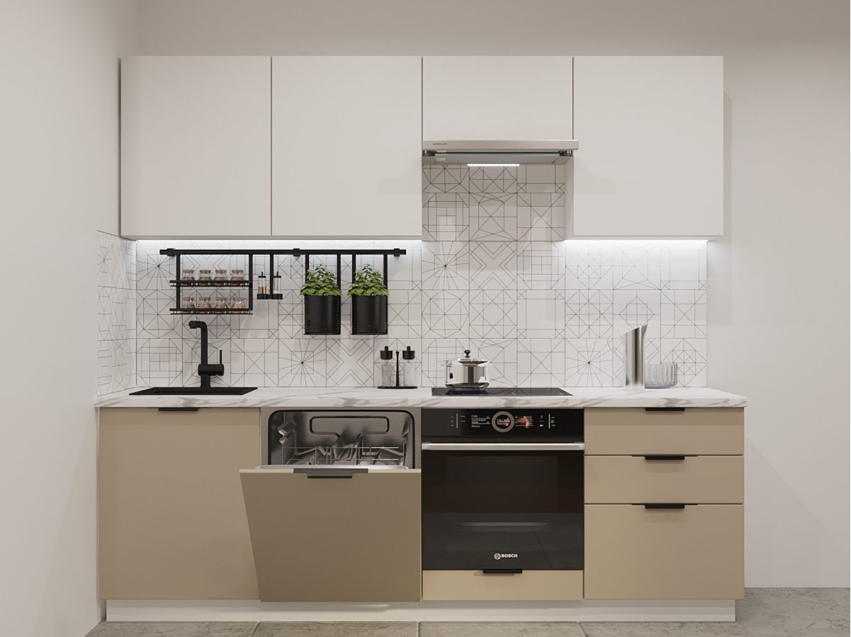 Кухонная мойка, стеновая панель, посудосушитель, планки для столешницы в комплект не входят.