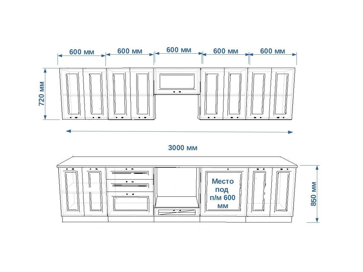 - высота верхних шкафов 720 мм
