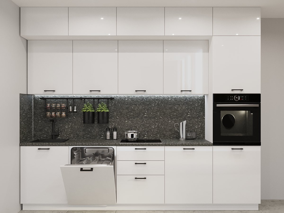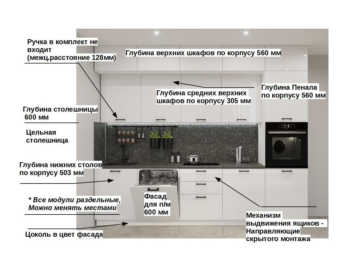 Кухонная мойка, стеновая панель, посудосушитель, планки для столешницы в комплект не входят.