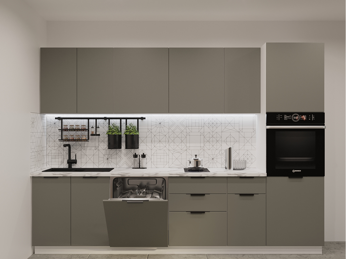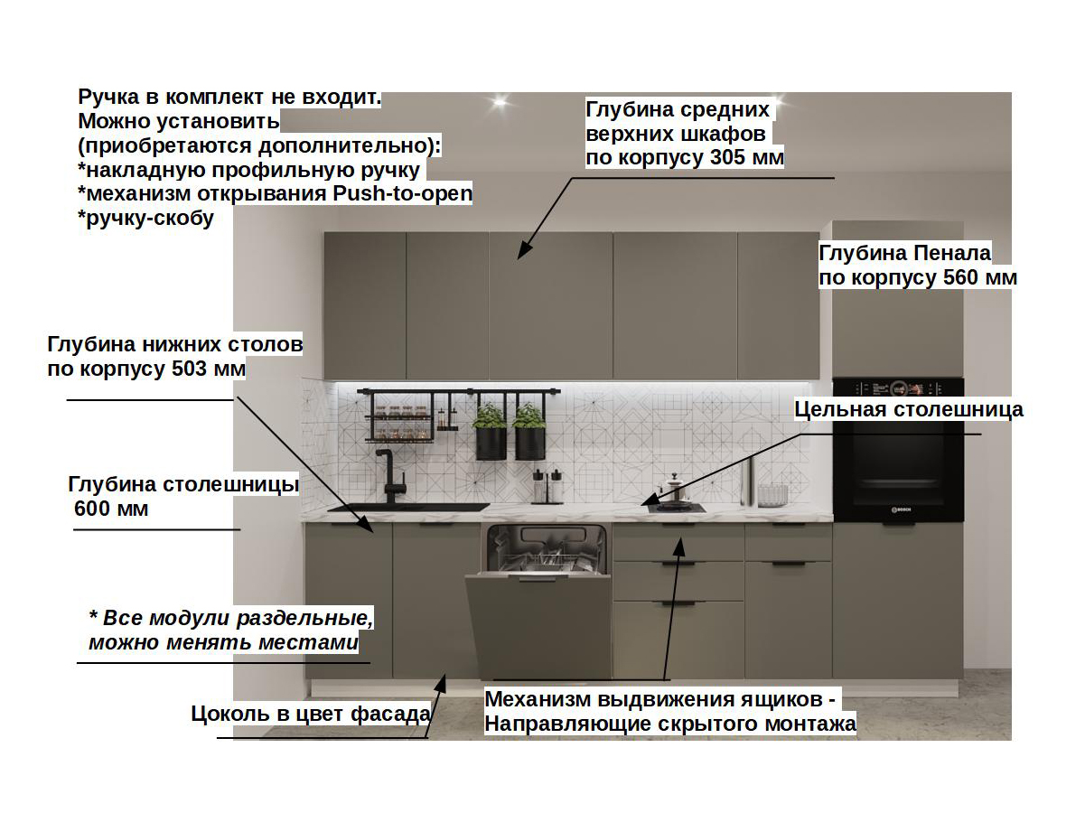 Кухонная мойка, стеновая панель, посудосушитель, планки для столешницы в комплект не входят.