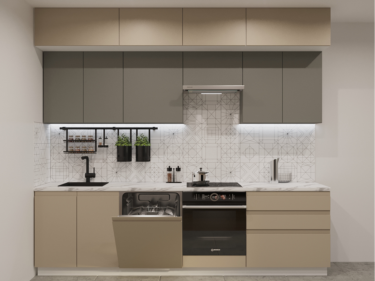 Кухонная мойка, стеновая панель, посудосушитель, планки для столешницы в комплект не входят.