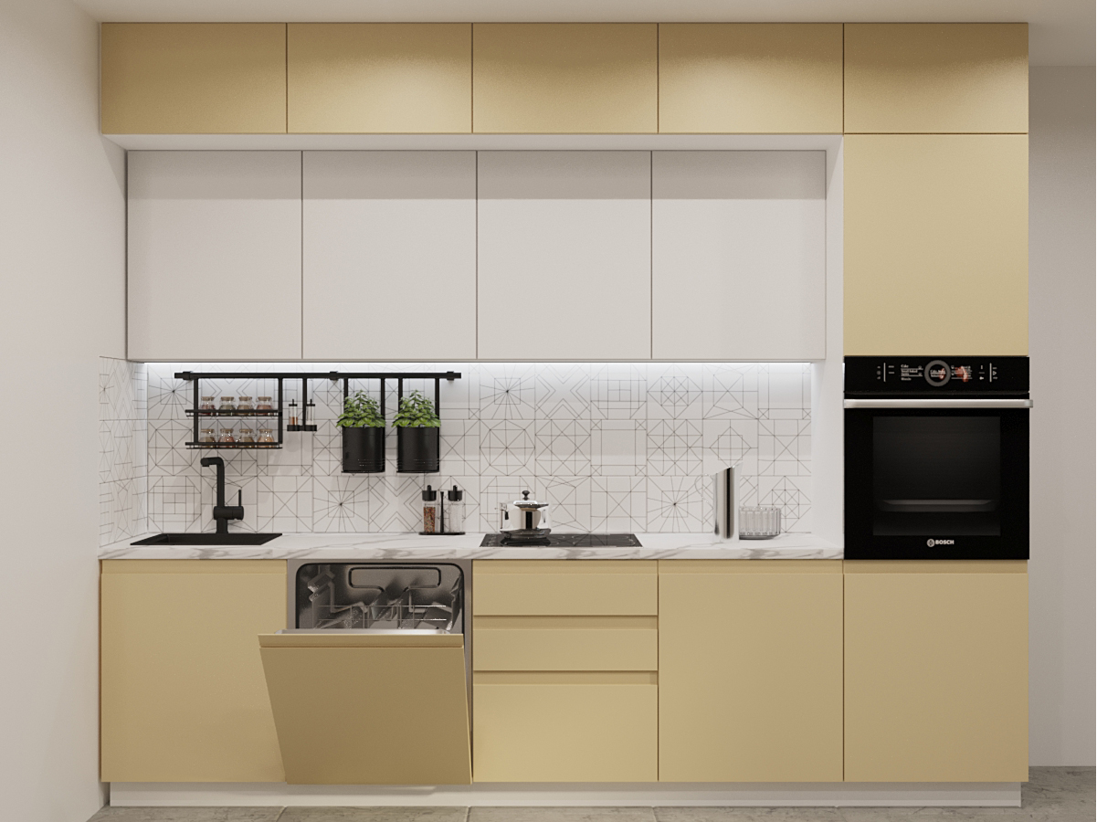 Кухонная мойка, стеновая панель, посудосушитель, планки для столешницы в комплект не входят.