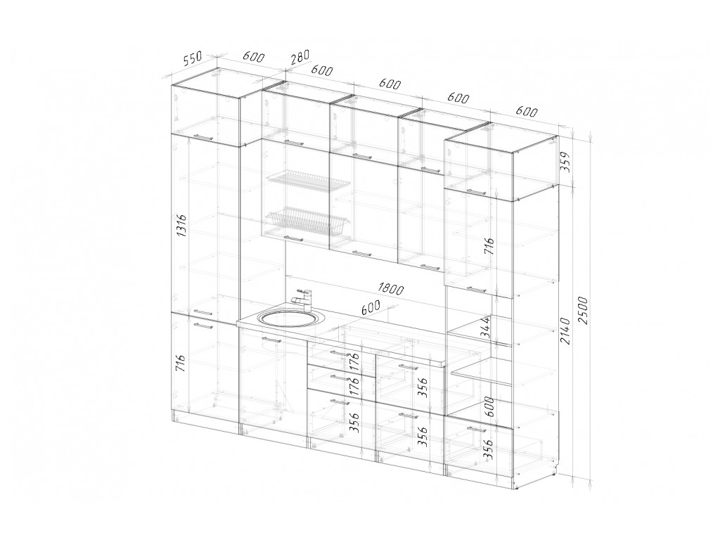 Мойка, смеситель, стеновая панель и посудосушитель в комплект гарнитура не входят.