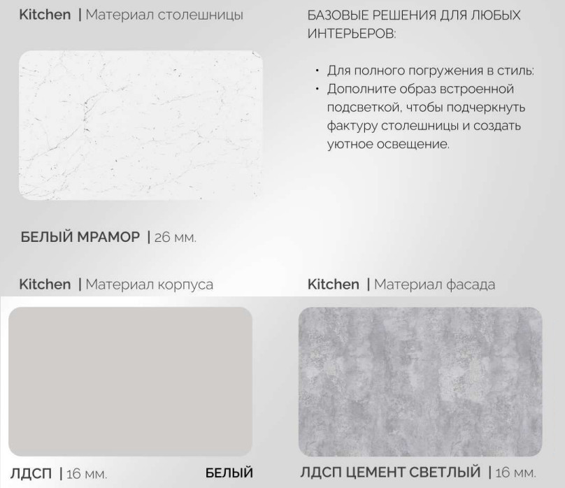 - ЛДСП корпус Белый текстурный, цоколь в цвет корпуса.
