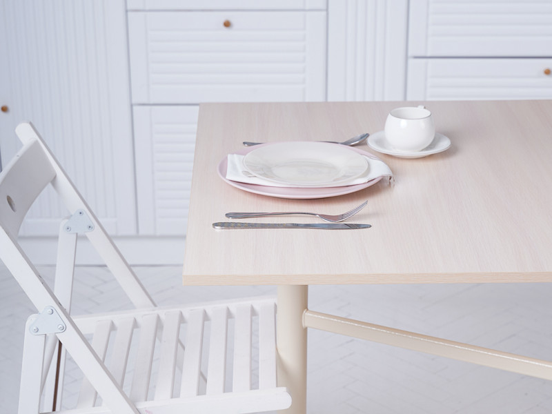 - Стол обеденный на кухню из прочного ЛДСП, с надежным раскладным механизмом.