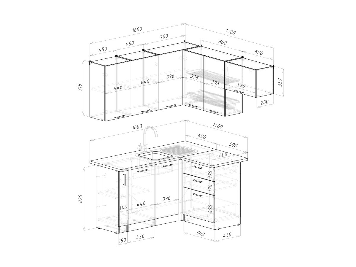 Мойка, смеситель, стеновая панель и посудосушитель в комплект гарнитура не входят.
