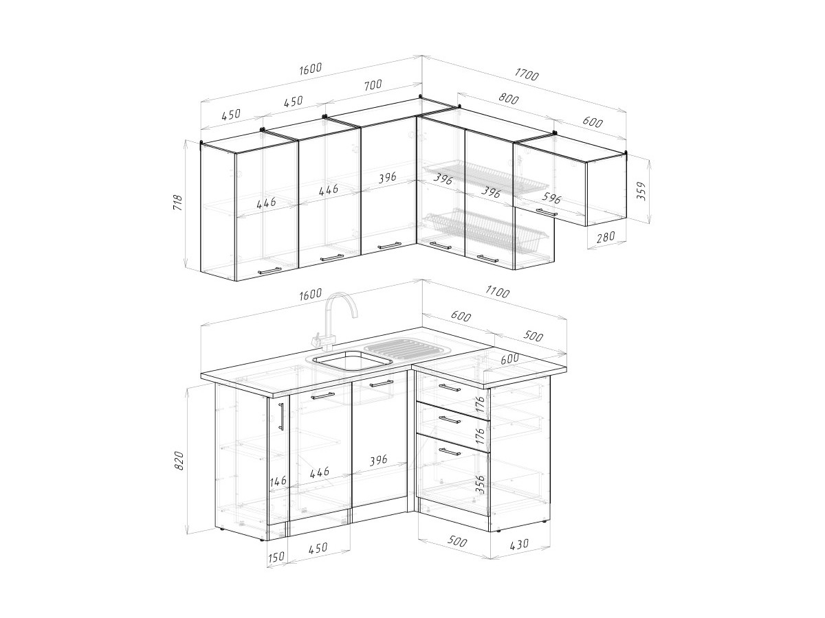 Мойка, смеситель, стеновая панель и посудосушитель в комплект гарнитура не входят.