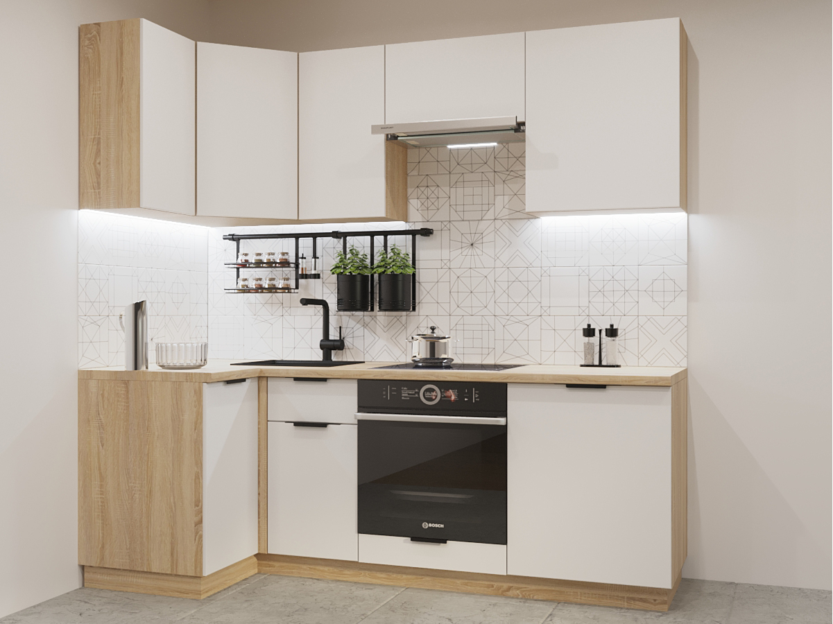 Кухонная мойка, стеновая панель, посудосушитель, планки для столешницы в комплект не входят.