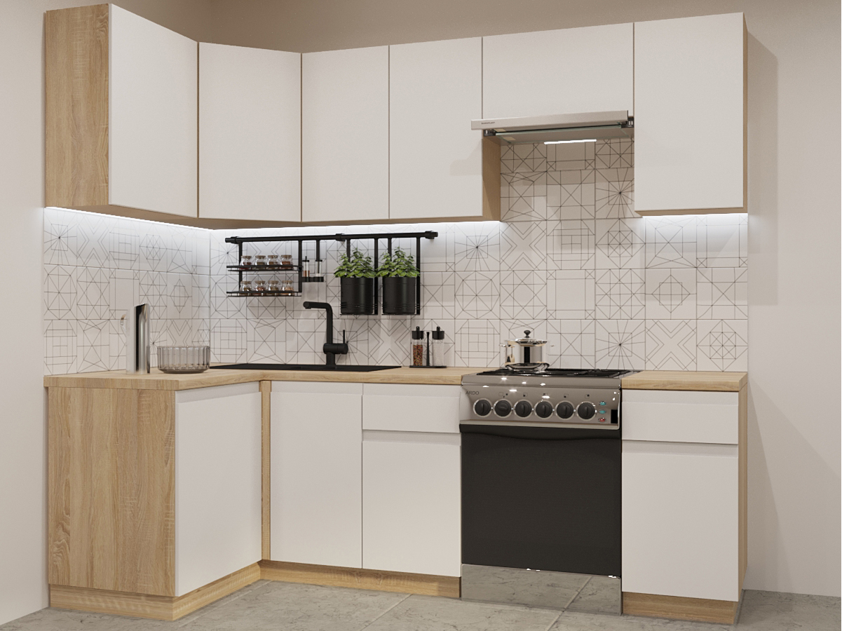 Кухонная мойка, стеновая панель, посудосушитель, планки для столешницы в комплект не входят.