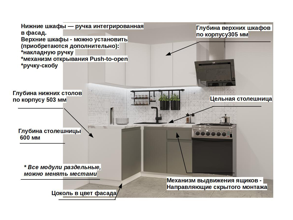 Кухонная мойка, стеновая панель, посудосушитель, планки для столешницы в комплект не входят.