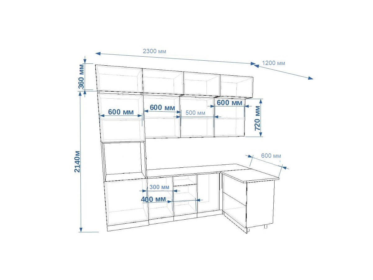 - высота верхних шкафов 720 мм