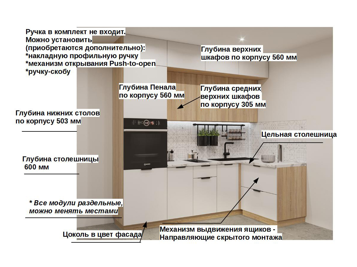 Кухонная мойка, стеновая панель, посудосушитель, планки для столешницы в комплект не входят.
