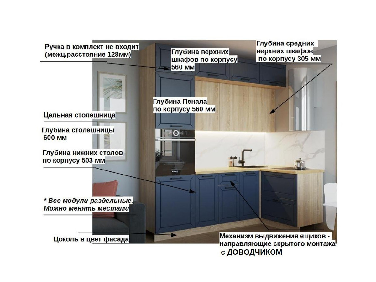 Кухонная мойка, стеновая панель, посудосушитель, планки для столешницы в комплект не входят.