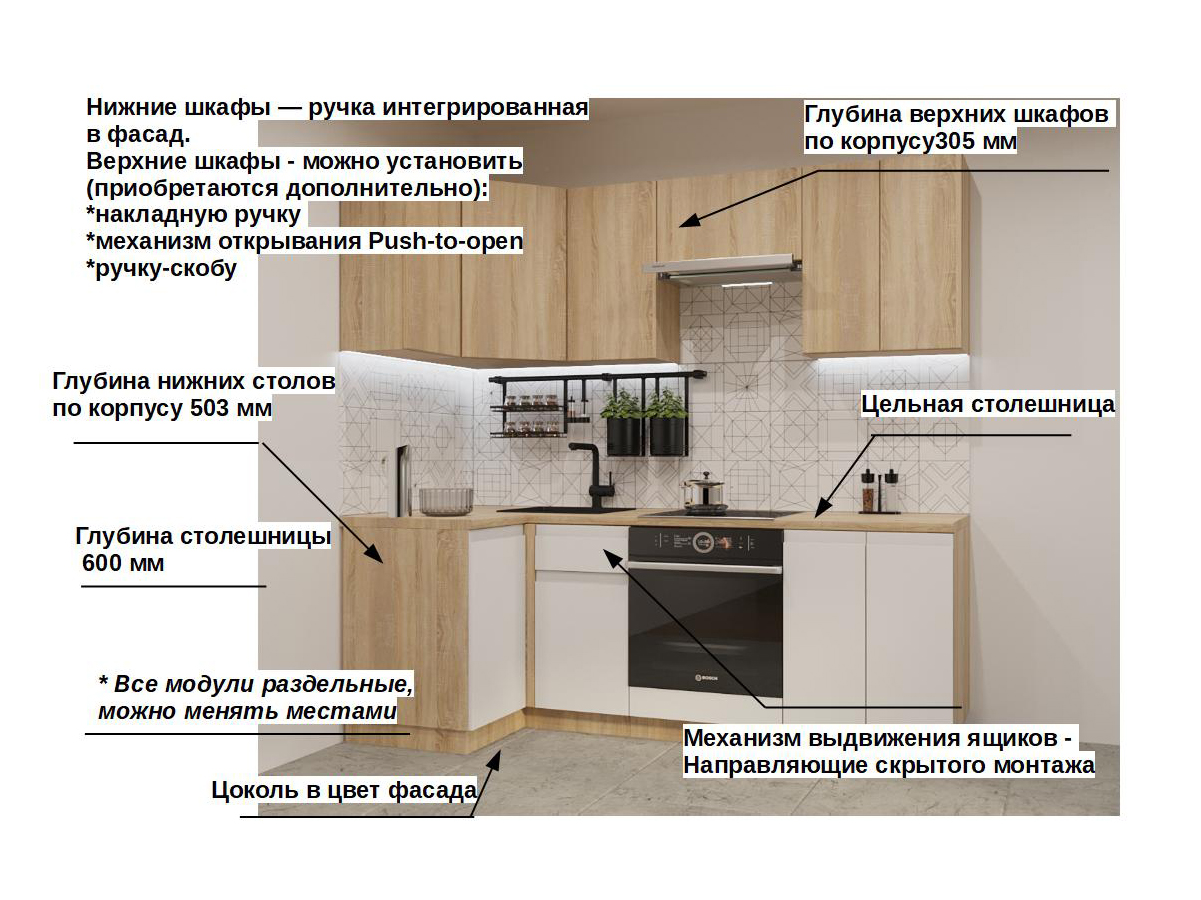 Кухонная мойка, стеновая панель, посудосушитель, планки для столешницы в комплект не входят.