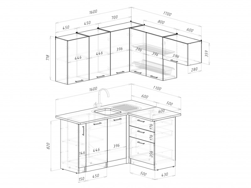 Мойка, смеситель, стеновая панель и посудосушитель в комплект гарнитура не входят.