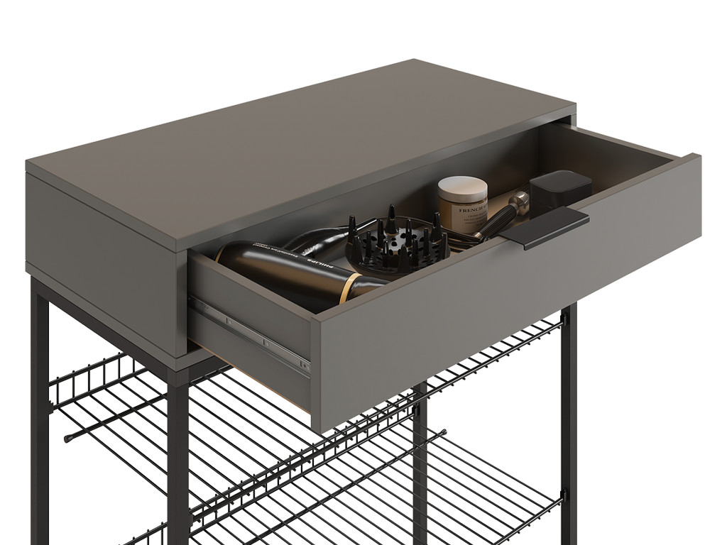 В выдвижном ящике на шариковых направляющих поместятся много полезных мелочей: фен, расчески, средства для чистки обуви и другие предметы.