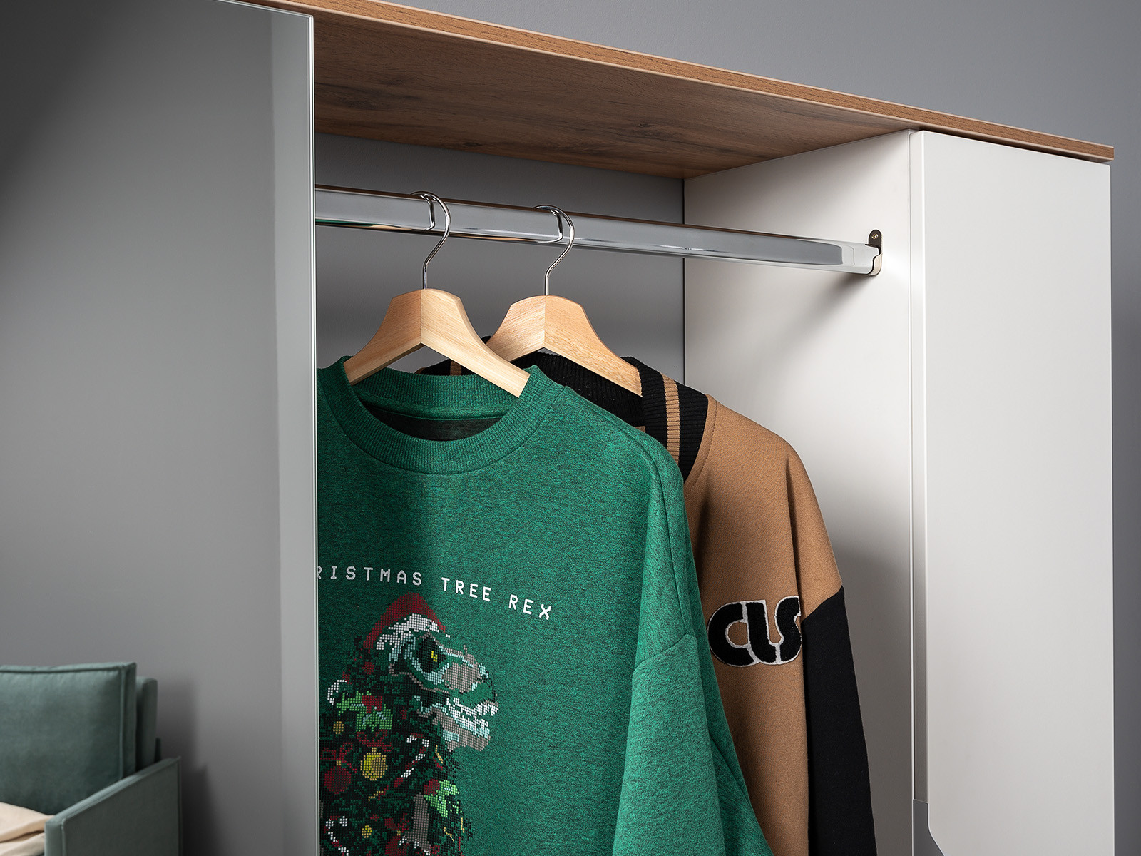 Фурнитура: Шариковые направляющие полного выдвижения, алюминиевые ручки, выдвижная вешалка
