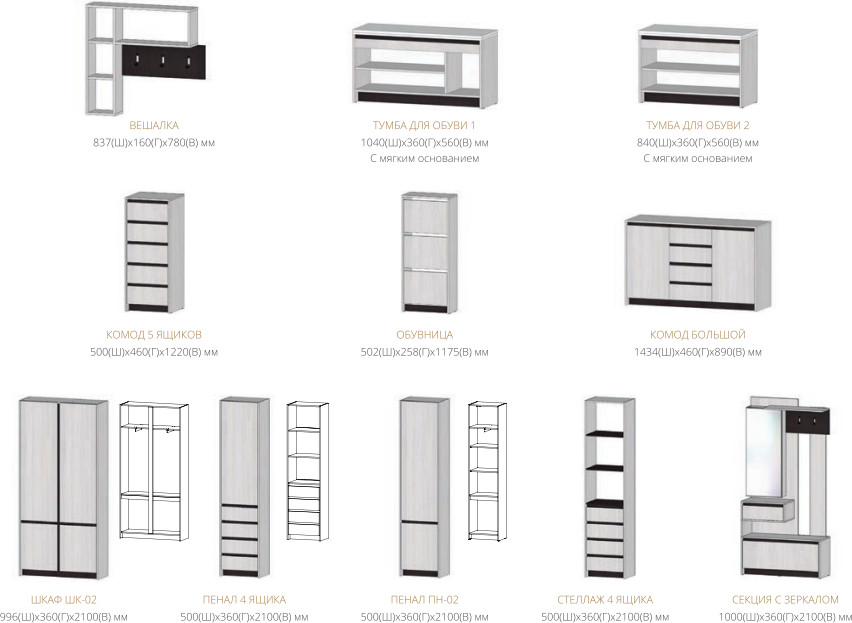 Цена за комплект: Вешалка, Обувница, Тумба для обуви 2, Шкаф ШК-02