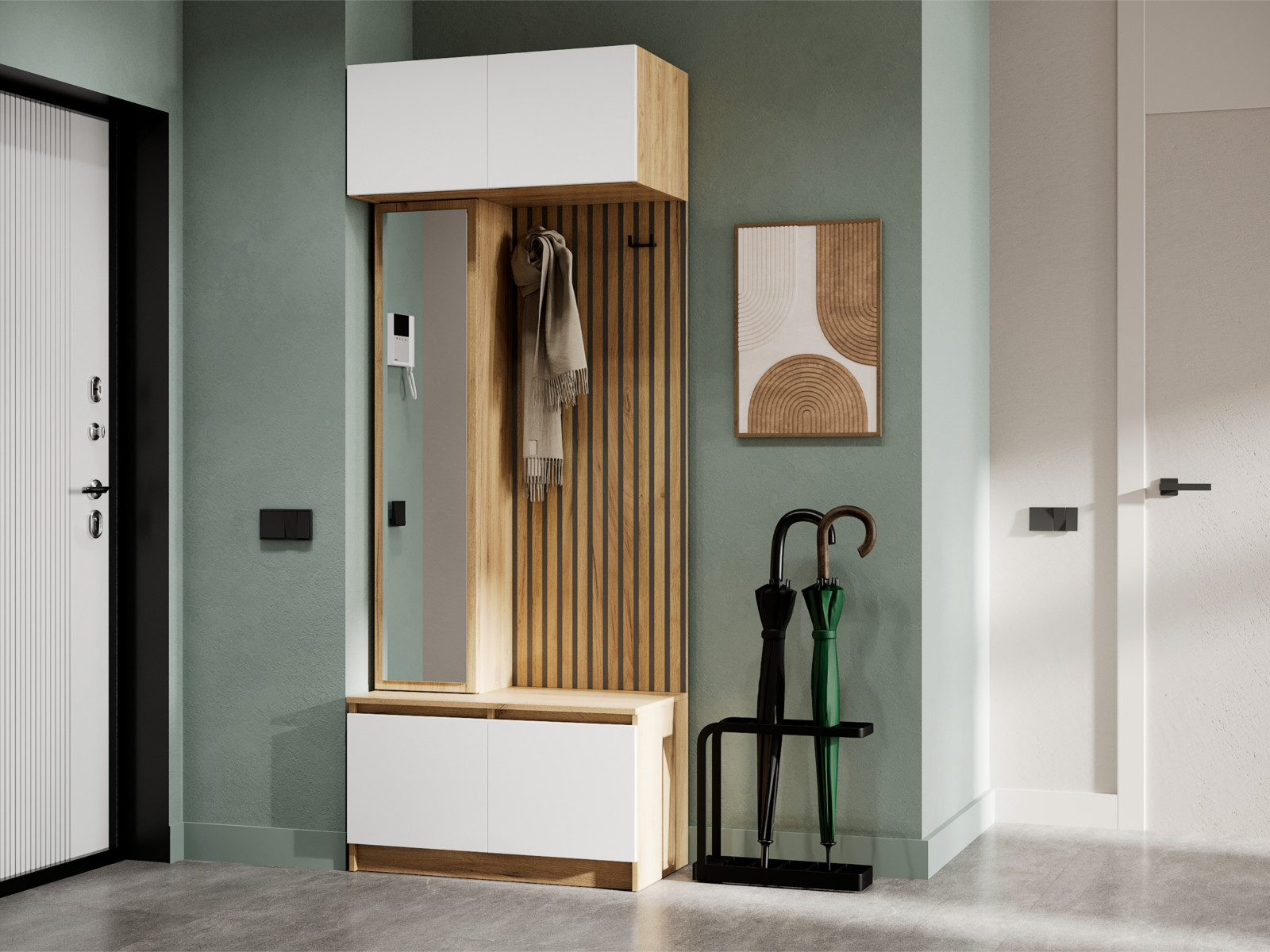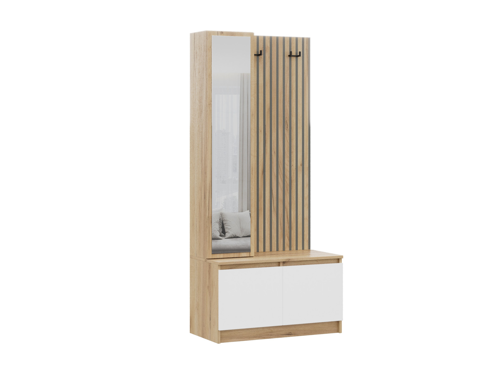 - Щит для одежды с крючками и фотопечатью (имитация реек).