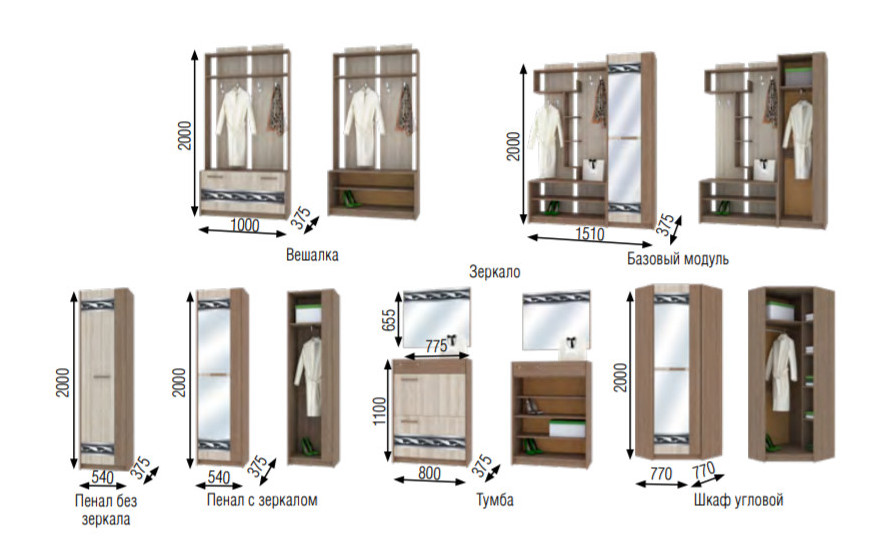 - базовый модуль (вешалка+пенал с зеркалом) Д 1540*Г375*В2000 мм