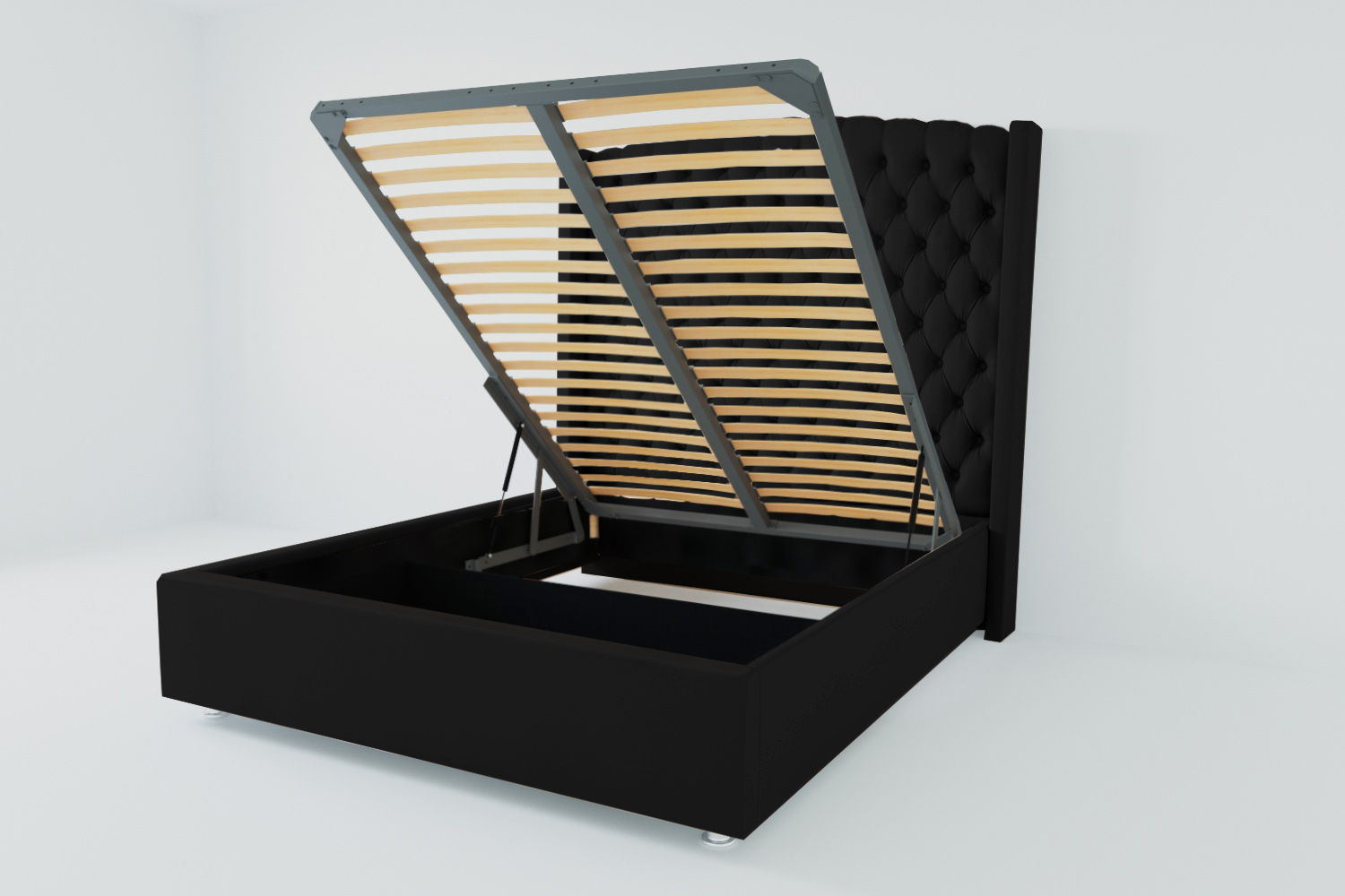Короб для белья установлен в нижней половине кровати, ее верхнюю половину занимает подъемный механизм.