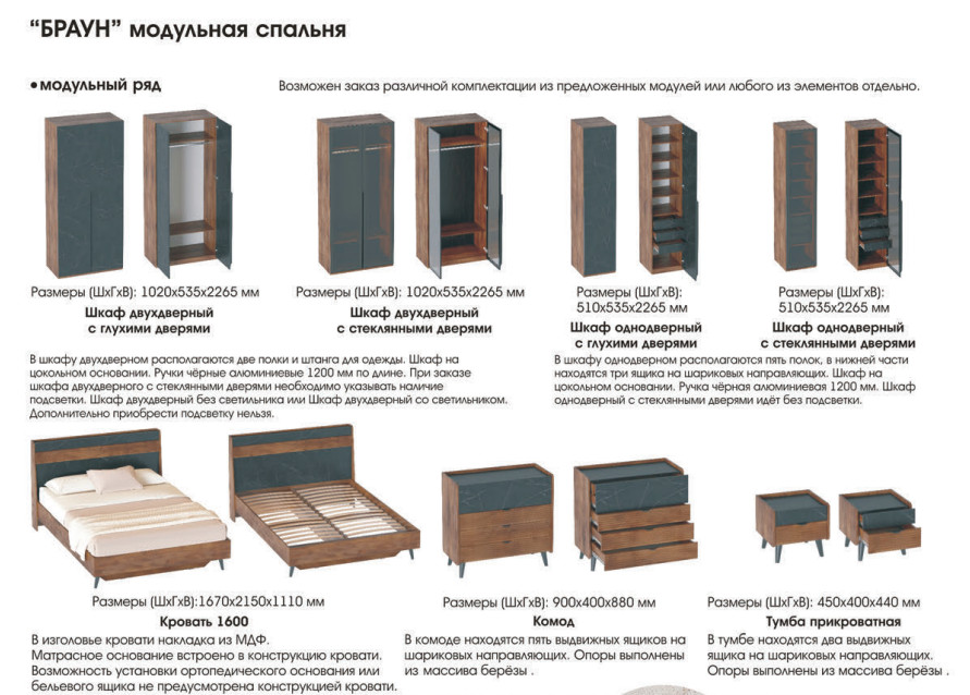 Комод, Кровать 1600, Тумба прикроватная, Шкаф 2-х дверный, Шкаф 1 дверный, Дверь глухая (3 шт)