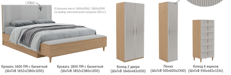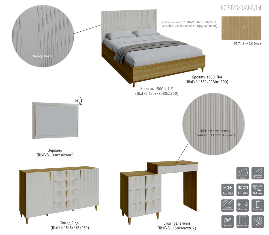Цена за комплект: Кровать 1600 с банкеткой, Тумба прикроватная, Тумба малая, Комод 2 двери, Зеркало, Стол туалетный 1698