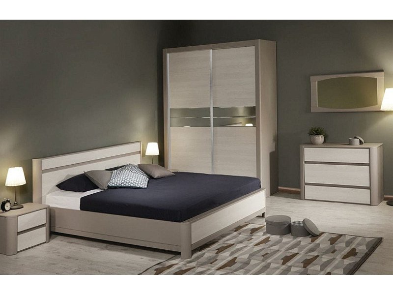 Цена за комплект: Тумбочка прикроватная (2 шт), Кровать с/м 2000*1400, Ортопедическое основание 1400*2000, Шкаф-купе 2-х дверный, Зеркало, Комод