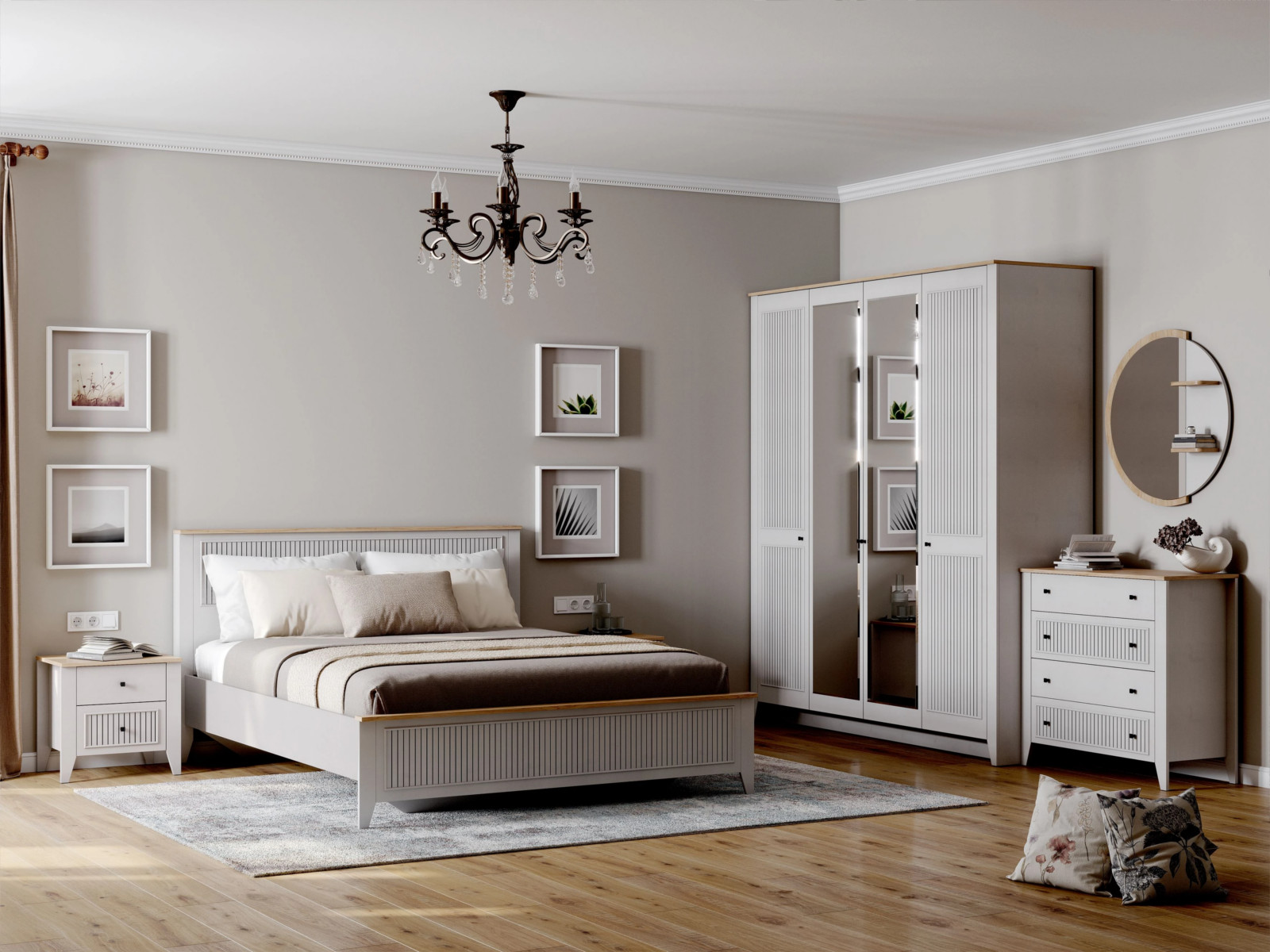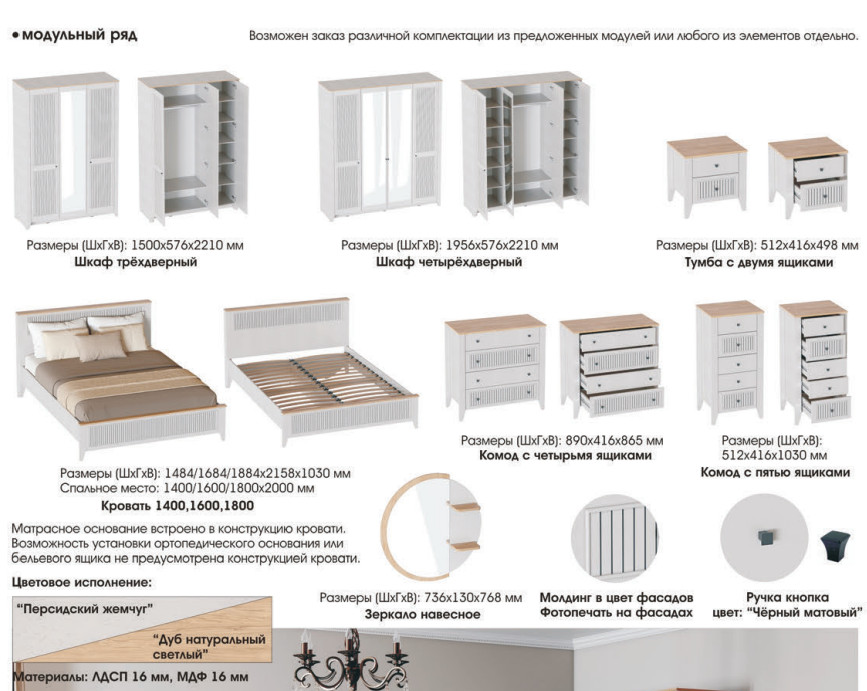 Цена за комплект: Зеркало навесное, Комод с 4 ящика, Шкаф 4 дверный, Кровать 1600, Тумба с 2 ящика (2 шт)