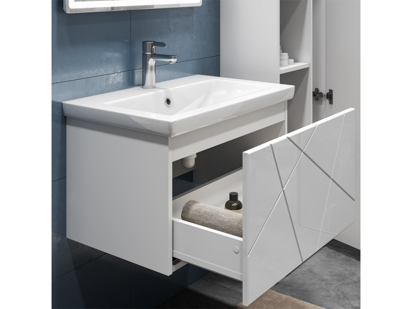 Оснащение: 1 выдвижной ящик, направляющие скрытого монтажа, открывание нажатием "push-to-open", 2 навеса, 1 сифон