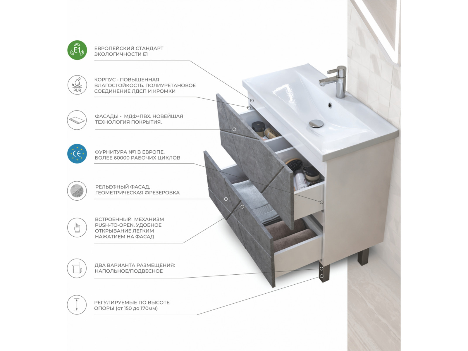 Оснащение: 2 выдвижных ящика, механизм открывания push-to-open, опоры квадратные регулируемые.
