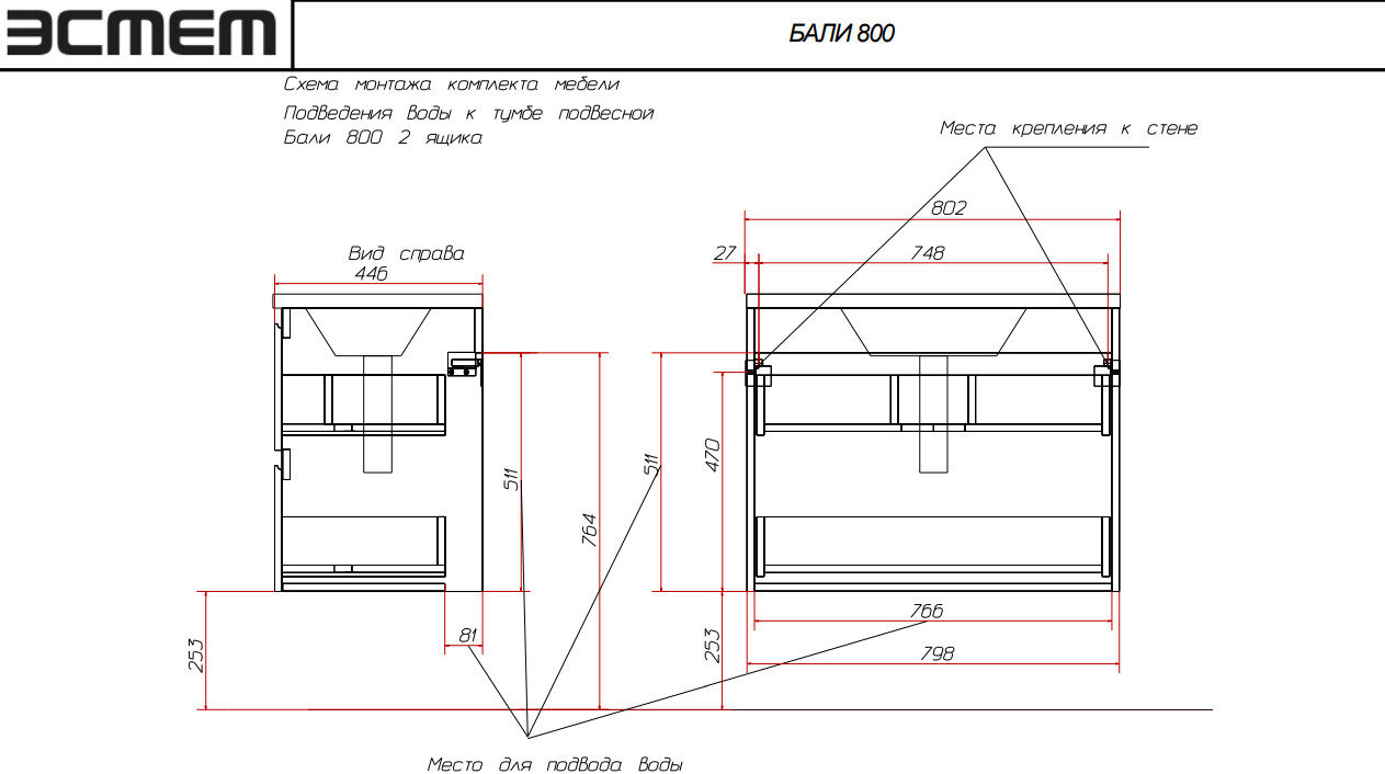 - Тумба с раковиной Bali 800 навесная 2 ящика