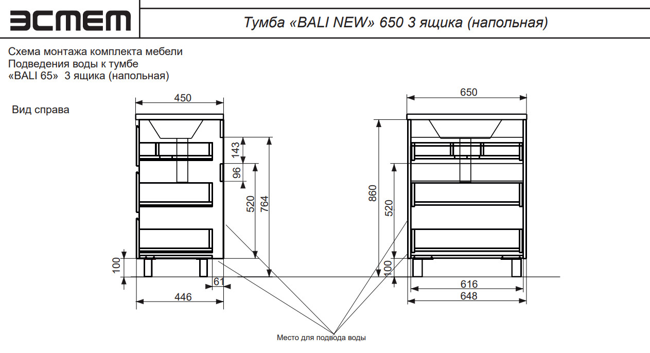 - Тумба с раковиной Bali new 650 напольная 3 ящика