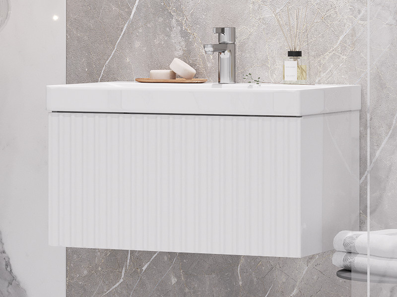 Материалы тумбы: МДФ, влагостойкая ЛДСП, полимерное покрытие ПВХ, врезная ручка, европейская фурнитура